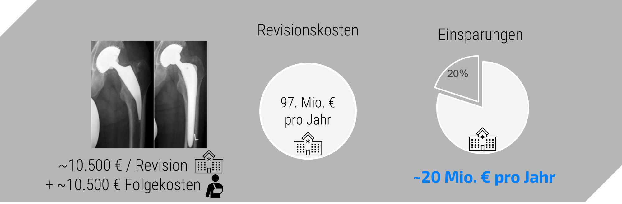 Nach unseren Recherchen belastet eine Revisions-Op ein Krankenhaus mit ca. 10.500€ direkten Kosten und ca. der gleiche Betrag fällt bei Patienten an sekundären Kosten wie z.B. Reha-maßnahmen an.